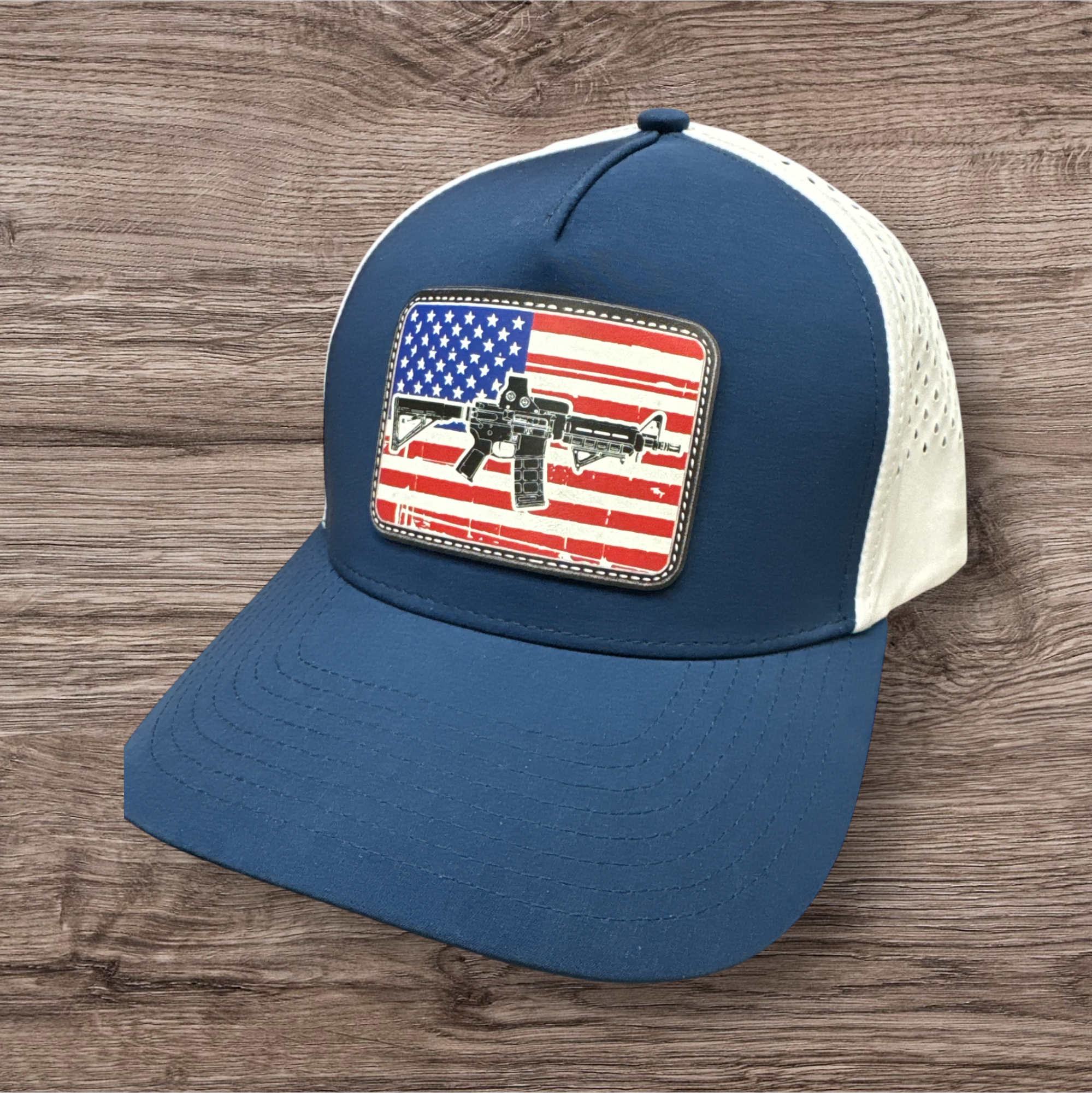 Show your pride with the Durra-Bull 5-Panel Hat! This isn’t just a hat; it’s a statement. The bold cobalt blue front and white mesh back create a striking contrast, while the UV-printed American flag and rifle patch proudly displays your values.